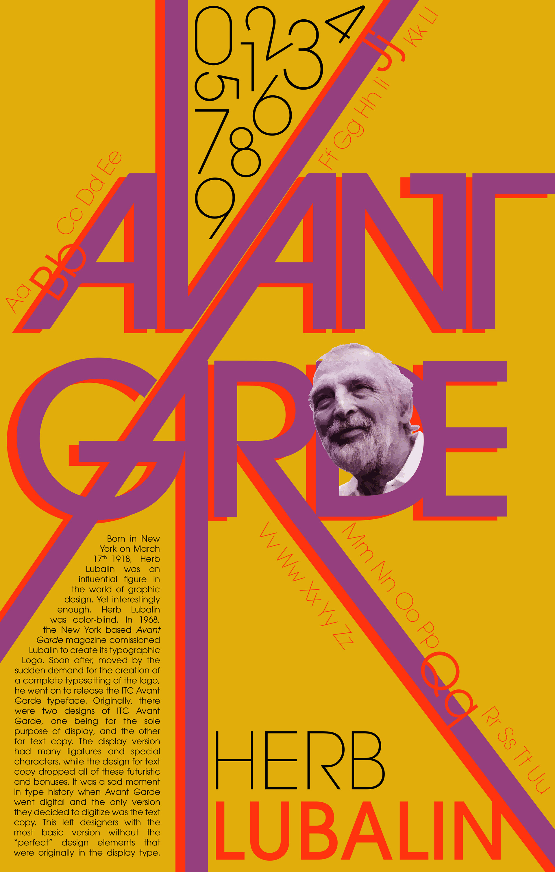 Creation of a typographic poster for the typeface "ITC Avant Garde" by the great designer Herb Lubalin. The poster is color blind safe, as herb lubalin was color blind !